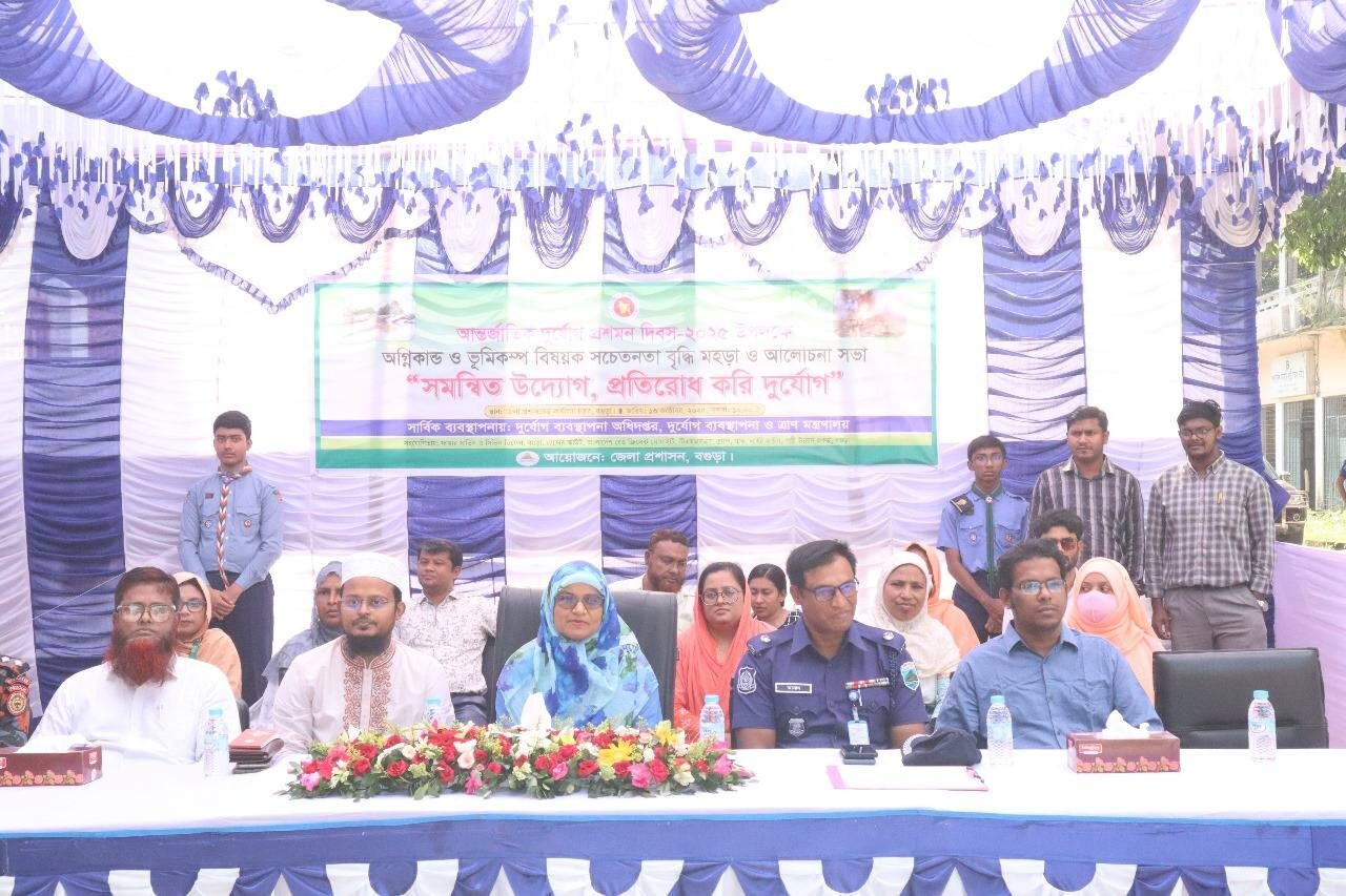 “সমন্বিত উদ্যোগ, প্রতিরোধ করি দুর্যোগ” এই প্রতিপাদ্যকে সামনে রেখে জেলা দুর্যোগ ব্যবস্থাপনা অধিদপ্তর, দুর্যোগ ব্যবস্থাপনা ও ত্রাণ মন্ত্রণালয় বগুড়া’র আয়োজনে ১৩ অক্টোবর ২০২৫ তারিখে জেলা প্রশাসকের কার্যালয় চত্বর, বগুড়ায়, আন্তর্জাতিক দুর্যোগ প্রশমন দিবস-২০২৫ উদযাপন উপলক্ষে অগ্নিকান্ড ও ভূমিকম্প বিষয়ক সচেতনতা বৃদ্ধি মহড়া ও আলোচনা সভা অনুষ্ঠিত হয়।